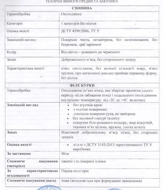 В договорі зазначено, що постачальник відповідає за те, щоб товар відповідав необхідному держстандарту та технічним вимогам. Також він має надавати документи про якість разом з кожною поставленою партією м’яса. Крім того, постачальник має 4 сертифікати ДСТУ ISO, які підтверджують, що підприємство відповідає державним стандартам якості. Приміром, сертифікат на систему управління безпечністю харчових продуктів