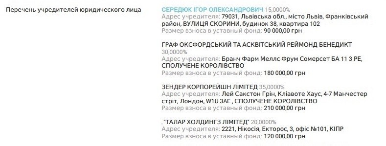 За інформацією з You control, серед засновників компанії – Середюк Ігор Олександрович, граф Оксфордський та Асквітський Реймонд Бенедикт (Сполучене Королівство), Зендер Корпорейшн Лімітед, Талар Холдингз Лімітед.