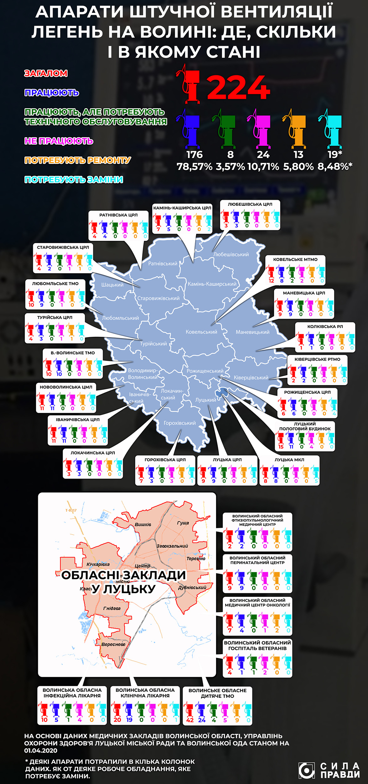 Такі дані «Сила правди» зібрала звернувшись з запитами про кількість та стан апаратів ШВЛ як до самих медзакладів, так і до управлінь охорони здоров’я Луцької міської ради та Волинської облдержадміністрації.