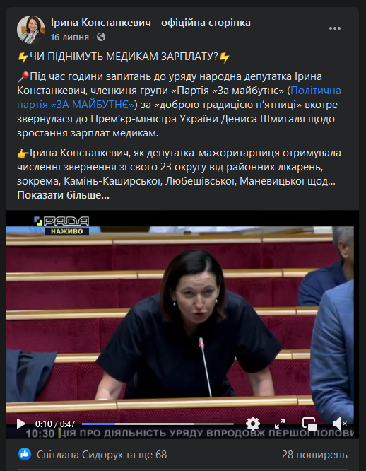 Загалом Ірина Констанкевич вже подала 62 запити у цьому скликанні. Серед найпопулярніших тем: освіта та наука, охорона здоров’я, соціальне забезпечення, місцеве самоврядування та земельні питання. Така кількість запитів забезпечує їй максимальний бал.