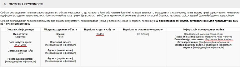 Оціночна вартість квартири становила 505 тисяч 453 гривні. Попереднім власником майна була громадянка Росії Анна Іванівна Мартинова.