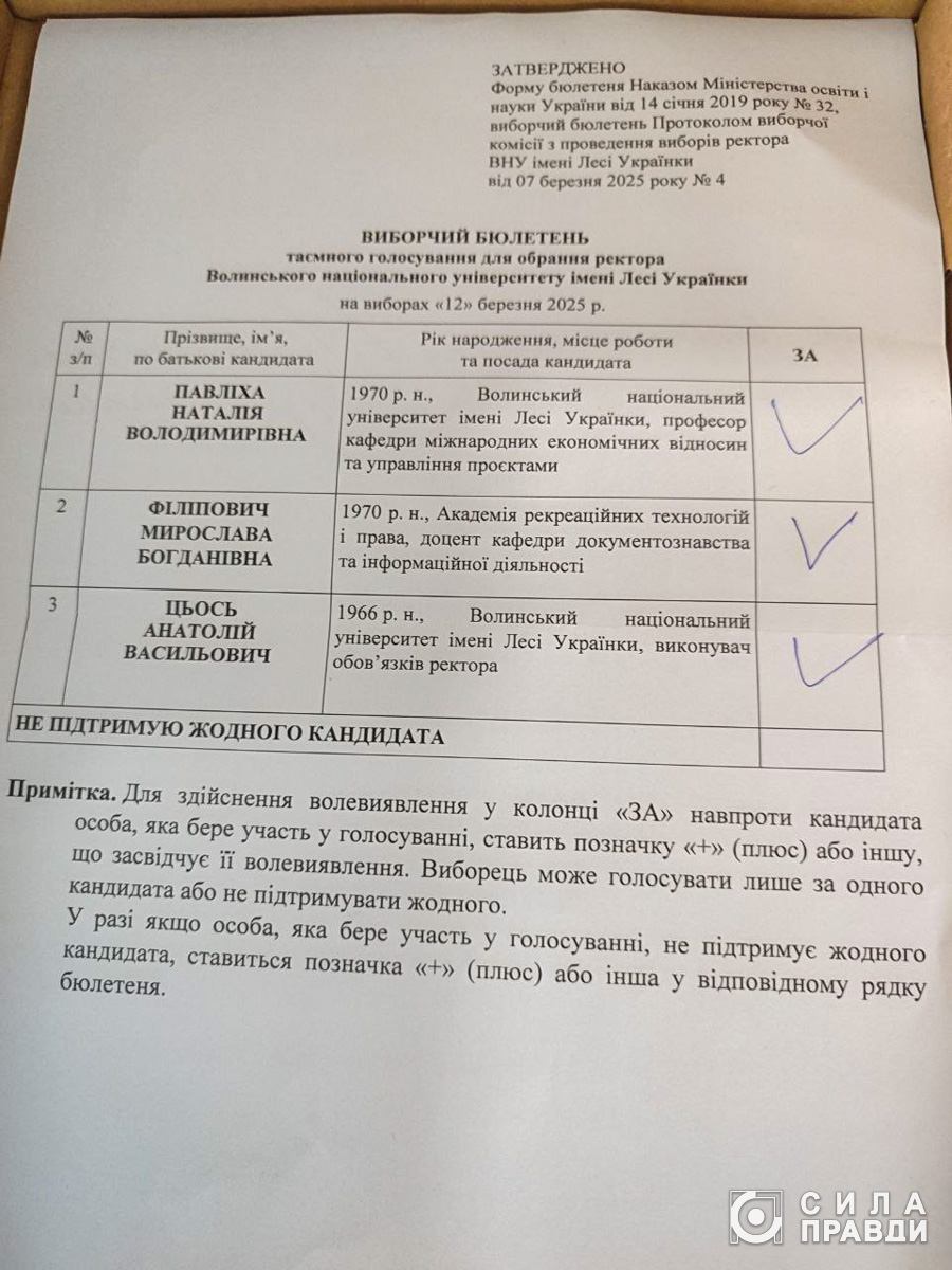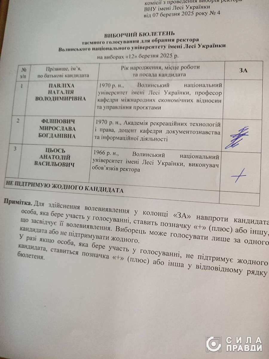 «За результатами підрахунку голосів перемогу одержав Цьось Анатолій Васильович. Вітаємо Анатолія Васильовича з обранням на посаду ректора Волинського національного університету імені Лесі Українки».