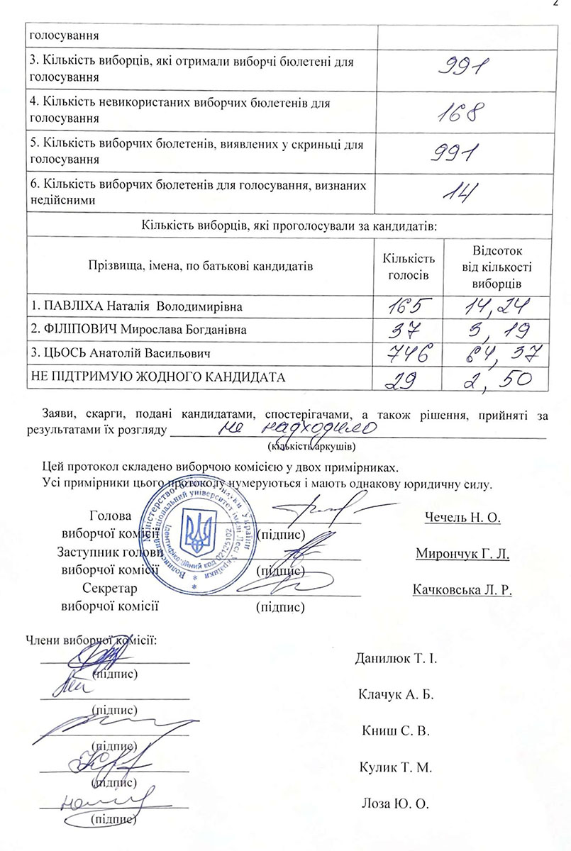 Підрахунок бюлетенів тривав більш як дві години. І врешті голова виборчої комісії Наталія Чечель оголосила результати таємного голосування: кандидат Анатолій Цьось набрав 746 голосів або 64,4%, кандидатка Наталія Павліха – 165 голосів або 14%, кандидатка Мирослава Філіпович – 37 голосів або 3%. Жодного кандидата не підтримали 29 виборців. 14 бюлетенів визнали недійсними. У повідомленні про підсумки виборів на сайті вишу розміщене й привітання переможцю: