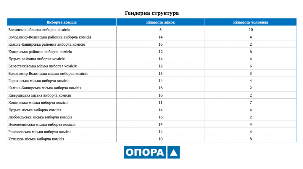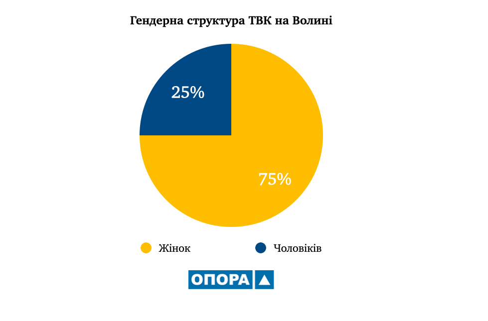 Склад Волинської обласної, Володимир-Волинської, Камінь-Каширської, Ковельської і Луцької районних, Берестечківської, Володимир-Волинської, Горохівської, Камінь-Каширської, Ківерцівської, Ковельської, Луцької, Любомльської, Нововолинської, Рожищенської і Устилузької міських виборчих комісій сформовано на 75% з осіб жіночої статі та на 25% – з осіб чоловічої статі. Зокрема, серед 288 представників територіальних виборчих комісій – 216 жінок та 72 чоловіки.