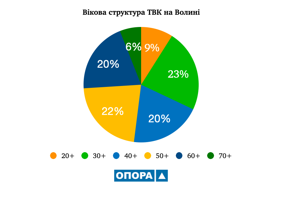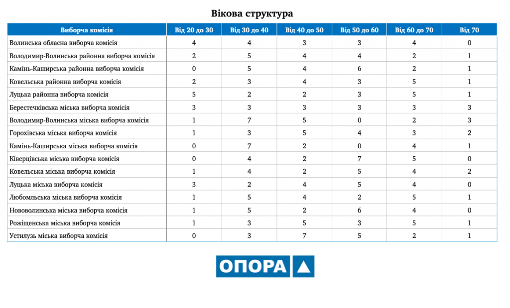 Громадянська мережа ОПОРА проаналізувала також віковий склад обласної, районних та міських виборчих комісій, утворених на Волині. За результатами дослідження, майже однакова кількість членів виборчих комісій потрапили до вікових категорій 30+, 40+, 50+ та 60+ – від 20% до 23% від усіх членів ТВК. Натомість, найменша кількість членів територіальних виборчих комісій потрапили до категорій 70+ та 20+ – 6% та 9% відповідно.