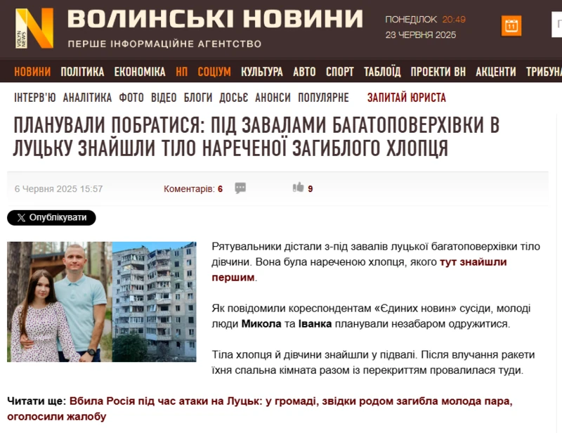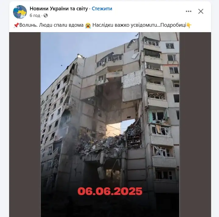 Тим часом у Facebook поширювалися інформацію про наслідки російського обстрілу зі світлинами не з Луцька, а… Харкова. Наприклад, на фейсбук-сторінці «Новини України та світу» опублікували фото з Харкова з підписом «Волинь. Люди спали вдома. Наслідки важко усвідомити… Подробиці».