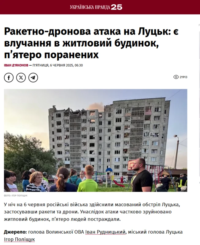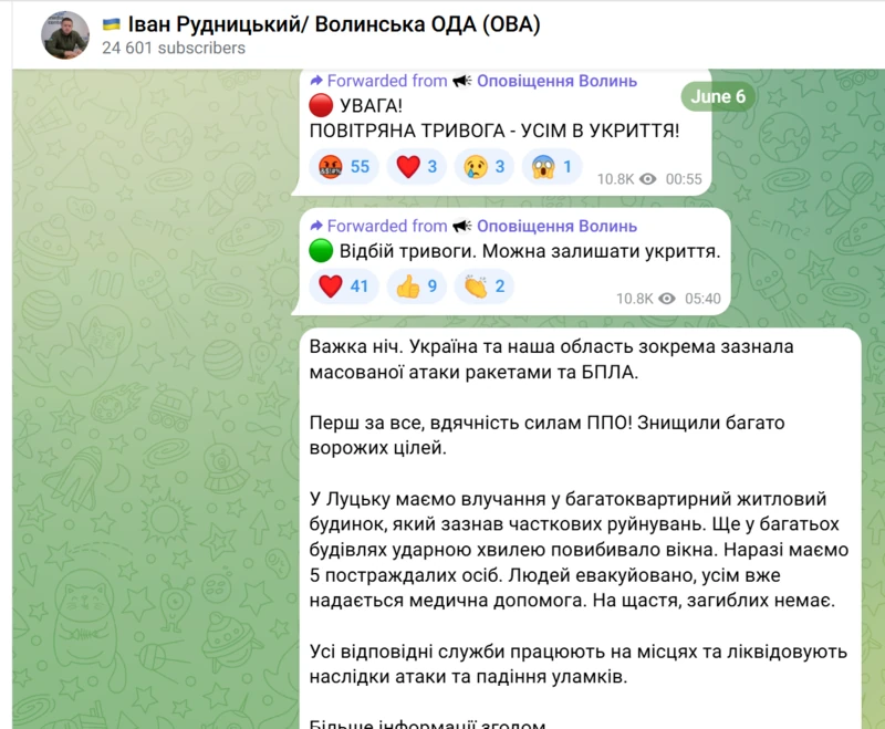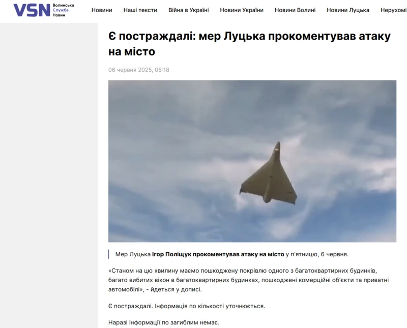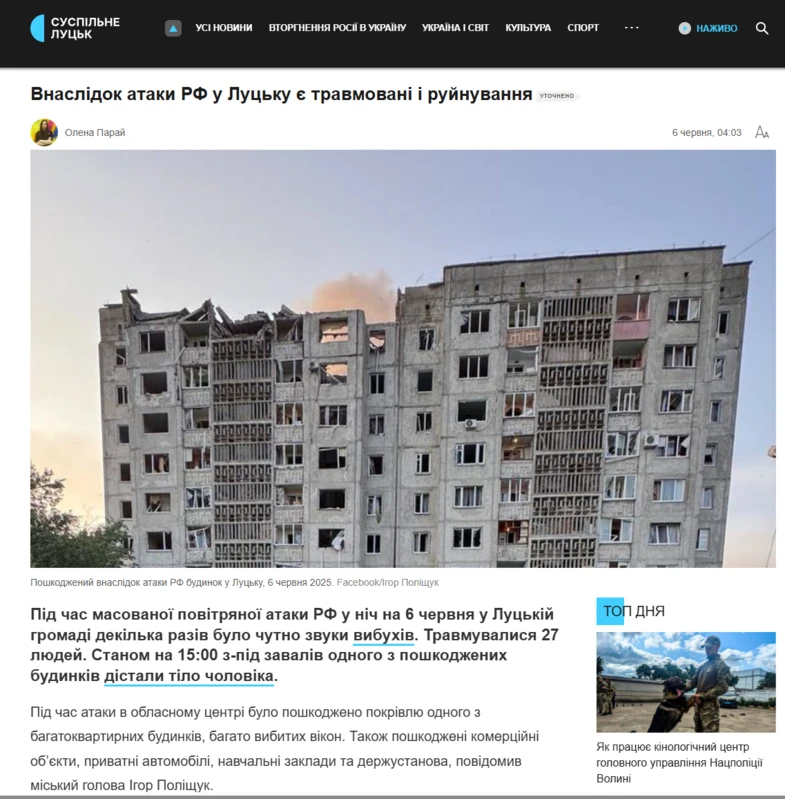 У ніч на 6 червня Луцьк зазнав наймасштабнішої ракетно-дронової атаки з Росії за весь час з початку повномасштабного вторгнення. Починаючи з 00:55 ночі до 5:40 ранку лунала повітряна тривога і гучні вибухи. Як висвітлювали цю атаку онлайн-медіа – у цьому матеріалі.