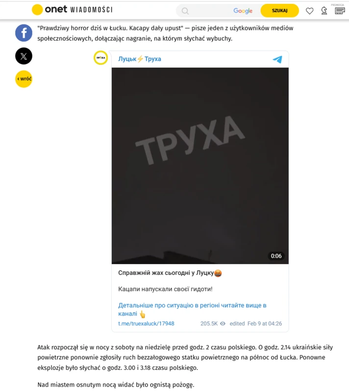Проте на цьому сайті послались не на офіційні джерела інформації, а на телеграм-канал «Труха Луцьк». Також у новині уточнили, що атака почалася в ніч на суботу перед 2 годиною ночі за польським часом.