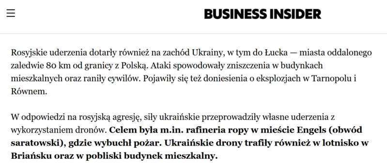 У новині «Масована атака Росії та відповідь України. Російський нафтопереробний завод у вогні» на польському сайті «Business Insider» новини стосувалися обстрілів Києва та Луцька. Зокрема, йшлося, що російська атака досягла також і Луцька, який, за їх словами, знаходиться за 80 км від польського кордону.
