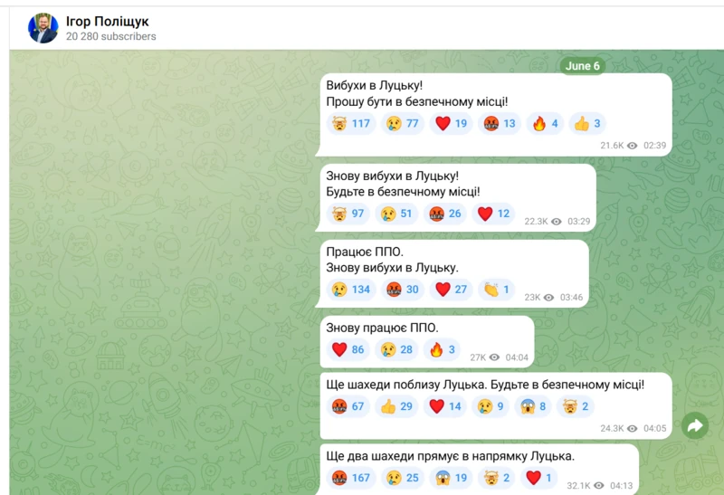 Наприклад, Ігор Поліщук оперативно інформував на власній сторінці телеграм-каналу про вибухи в місті, напрямки шахедів та ракет, роботу протиповітряної оборони.