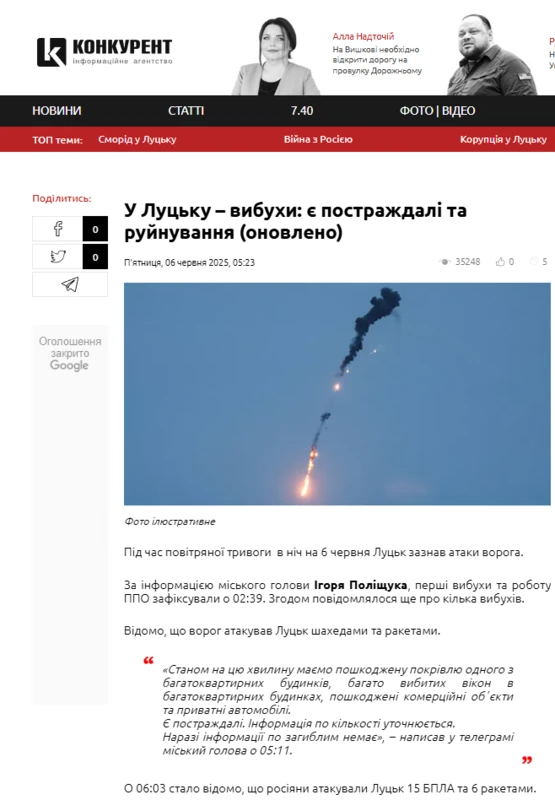 На сайті «Конкурент» головним спікером по темі атаки з Росії також став луцький міський голова. Журналісти оперативно інформували читачів. Наприклад, з посиланням на мера, вони повідомили про перші вибухи о 02:36 в ніч на 6 червня та роботу ППО. Згодом медійники повідомляли ще про кілька вибухів.