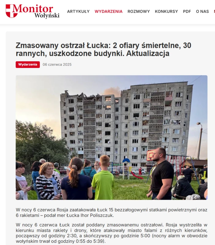 У двомовній українсько-польській газеті «Monitor Wołyński» журналісти посилалась на мера Луцька та голову Волинської ОВА. Наприклад, про те, що з багатоквартирного житлового будинку, що зазнав руйнувань, евакуювали людей, а також про підтвердження смерті двох людей.