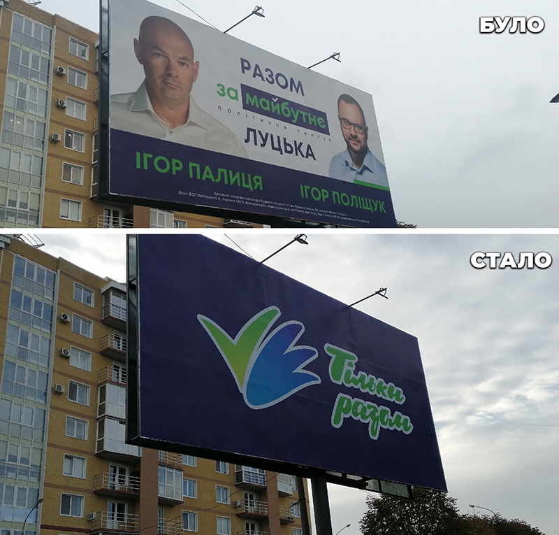 Зокрема, в день голосування 25 жовтня у місті було розміщено щонайменше 47 площин із логотипом фонду народного депутата України, лідера виборчих списків партії «За Майбутнє» до Луцької міської та Волинської обласної ради Ігоря Палиці «Тільки разом» на фіолетовому фоні, який використовувався у виборчій кампанії політичної партії «За Майбутнє».