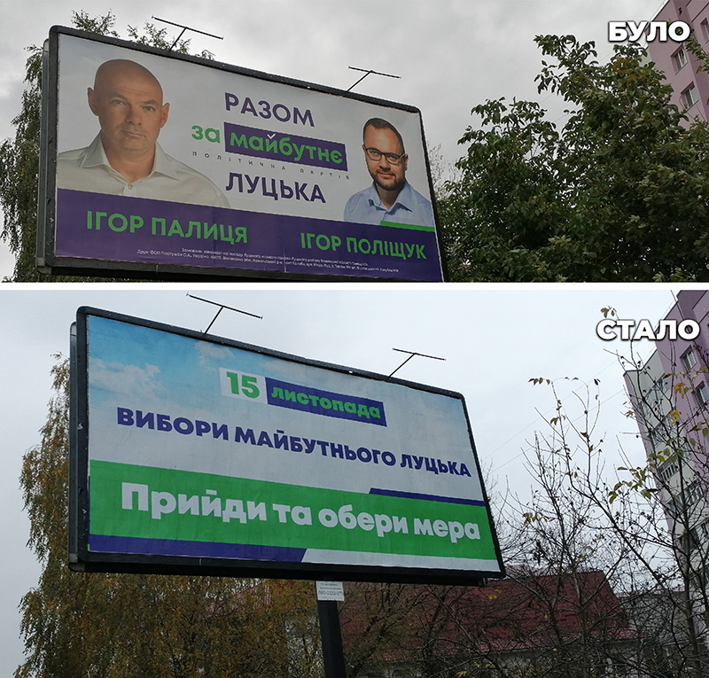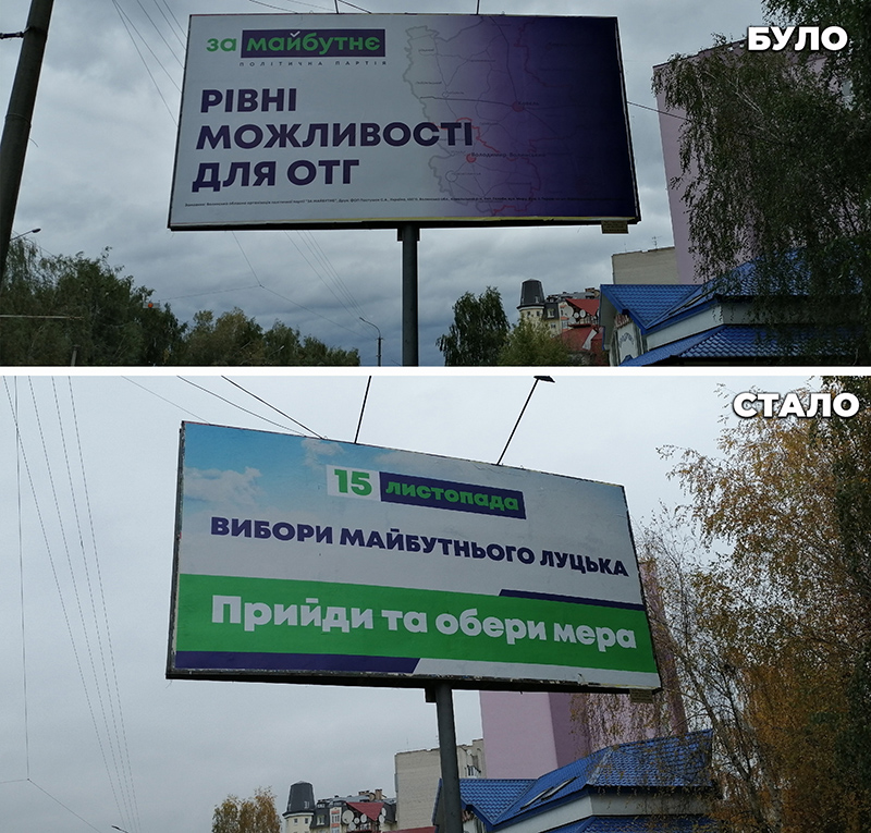 А 15 листопада – в день другого туру виборів міського голови – в місті було ще щонайменше 54 площини в стилістиці політичної партії «За Майбутнє», яка висунула кандидатом на посаду мера Ігоря Поліщука. На них на фоні блакитного неба було розміщено напис: «15 листопада. Вибори майбутнього Луцька. Прийди та обери мера».