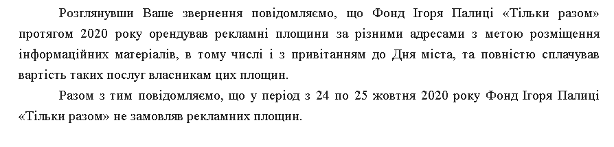 Як не дивно, але у фонді «Тільки разом» також повідомили, що не замовляли реклами зі своїм логотипом. У письмовій відповіді на запит «Силі правди» підтвердили, що замовляли привітання до Дня міста, але не повідомили його вартість. А от щодо реклами, розміщеної 24-25 жовтня, то запевнили, що не замовляли її.
