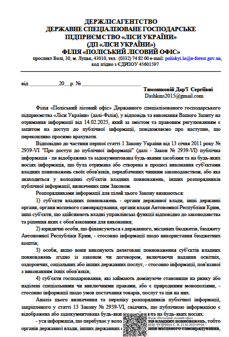 Після отримання відповіді на запит, який Центр журналістських розслідувань «Сила правди» надіслав у Поліській лісовий офіс, ситуація теж не прояснилась.