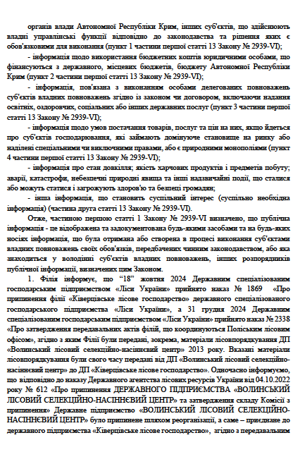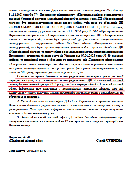 «Оскільки матеріали базового лісовпорядкування попередніх років до Філії передані не були, а у матеріалах лісовпорядкування ДП «Волинський лісовий селекційно-насіннєвий центр» 2013 року, що були передані Філії «Поліський лісовий офіс», інформація про вилучення з держлісфонду земельних ділянок, про які запитується у запиті відсутня, надати інформацію про їх вилучення з держлісфонду не вбачається за можливе», – йдеться у відповіді за підписом керівника Поліського лісового офісу Сергія Чуприни.