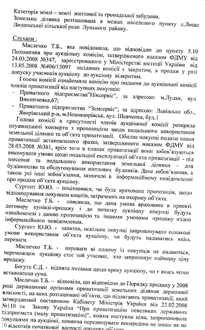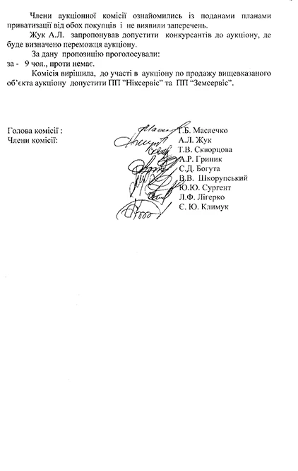 За лот зі стартовою ціною 6 мільйонів 694 тисячі гривень змагалися два приватні підприємства «Земсервіс» та вже згаданий «Ніксервіс». У результаті торгів за 7 мільйонів 364 тисячі гривень 42 будівлі разом із ділянкою 3,24 га придбав «Ніксервіс».