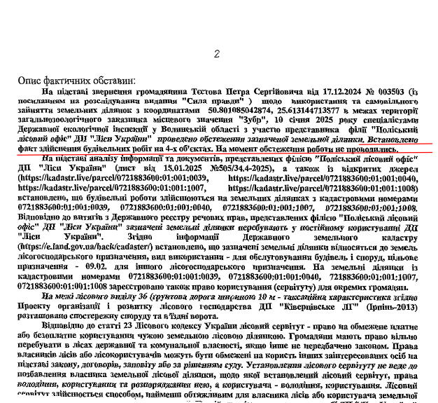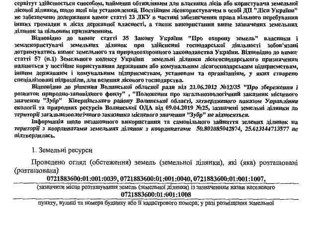 «Відповідно до витягів з Державного реєстру речових прав, представлених філією «Поліський лісовий офіс» ДП «Ліси України», зазначені земельні ділянки перебувають у постійному користуванні ДП «Ліси України». Згідно інформації Державного земельного кадастру встановлено, що зазначені земельні ділянки відносяться до земель лісогосподарського призначення, вид використання – для обслуговування будівель і споруд», – йдеться у документі.