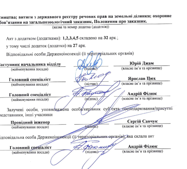 Цей документ підписали заступник начальника відділу Держекоінспекції в області та колишній лісівник Юрій Джам, головні спеціалісти Ярослав Цюх та Андрій Філюк, а також провідний інженер філії «Поліський лісовий офіс» ДП «Ліси України» Сергій Савчук.