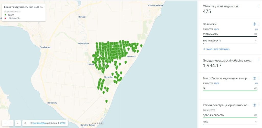 Описати все майно, яке належить родині Ігоря Палиці та їхнім компаніям словами практично неможливо. Тому «Сила правди» підготувала інтерактивну карту того, що вдалося дізнатися. На ній позначені два типи майна: земля та нерухомість. На вмонтованих віджетах можна різним чином фільтрувати відображені дані, а лічильник вгорі показує кількість об’єктів, яка залишається в полі зору при масштабуванні карти. Рекомендуємо переглядати карту та працювати з нею із комп’ютера, а не смартфона.