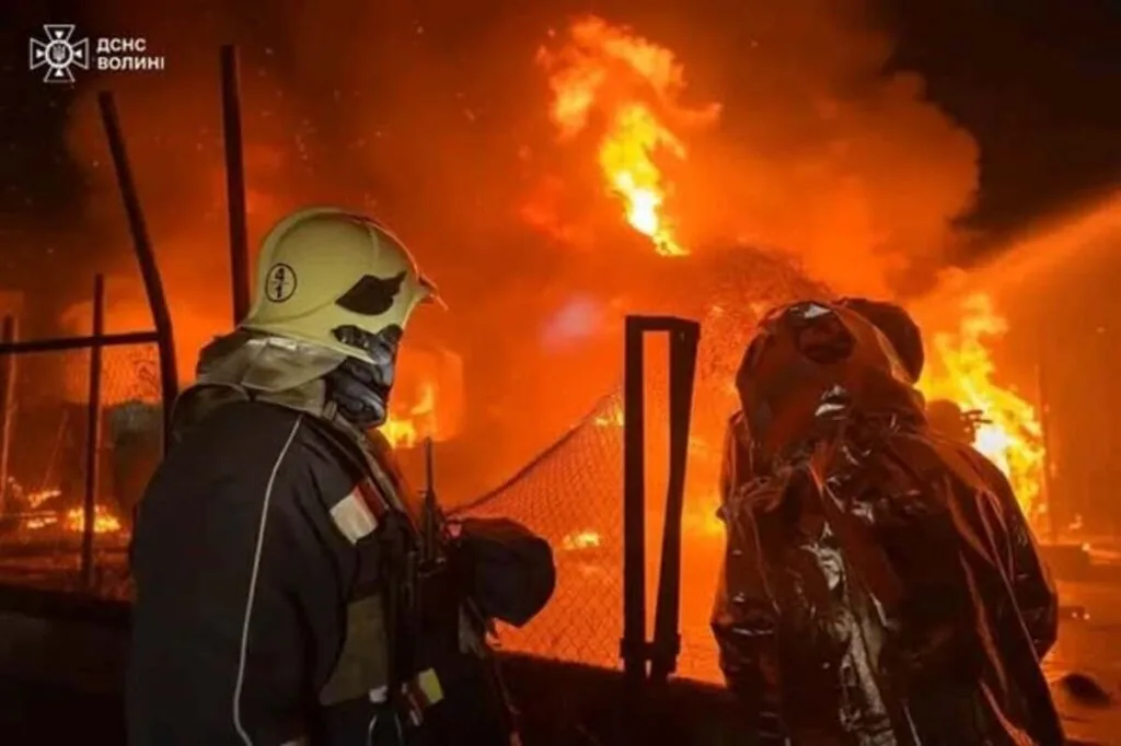 «На Волині ліквідували пожежу, що виникла внаслідок чергової російської атаки. На місці працювали понад 20 вогнеборців та 5 пожежних автоцистерн. На щастя, постраждалих немає».