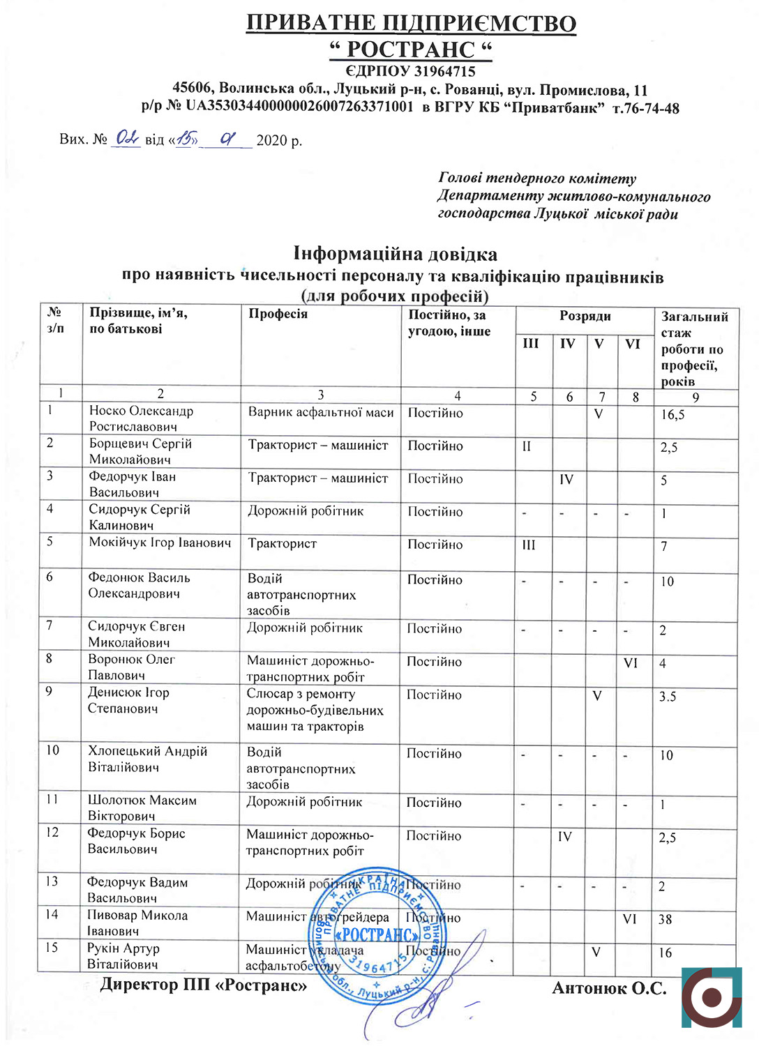 А це свіжа довідка про працівників компанії «Ространс», яких залучають на ремонти доріг і дворів у Луцьку. Зокрема, і водіїв транспортних засобів.
