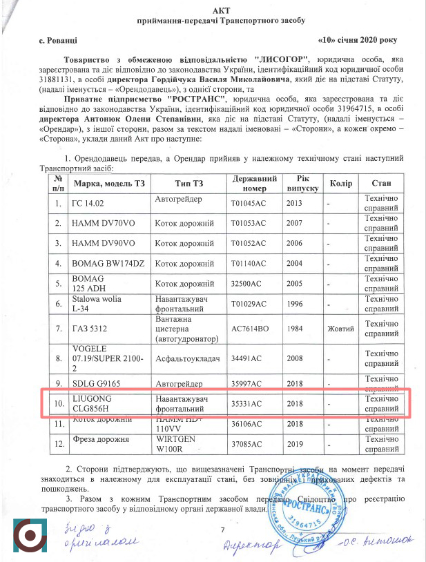 Окрім того, навантажувачі, які 4 лютого трощили ринкові контейнери, постійно залучають до ремонтів дворів і доріг за бюджетні кошти. Ось витяг з договору оренди техніки про те, що ТОВ «Лисогор» Гордійчука передає «Ространсу» той самий китайський навантажувач «LiuGong 856H», який знищив кутовий контейнер на розі Замкової та Глушець.