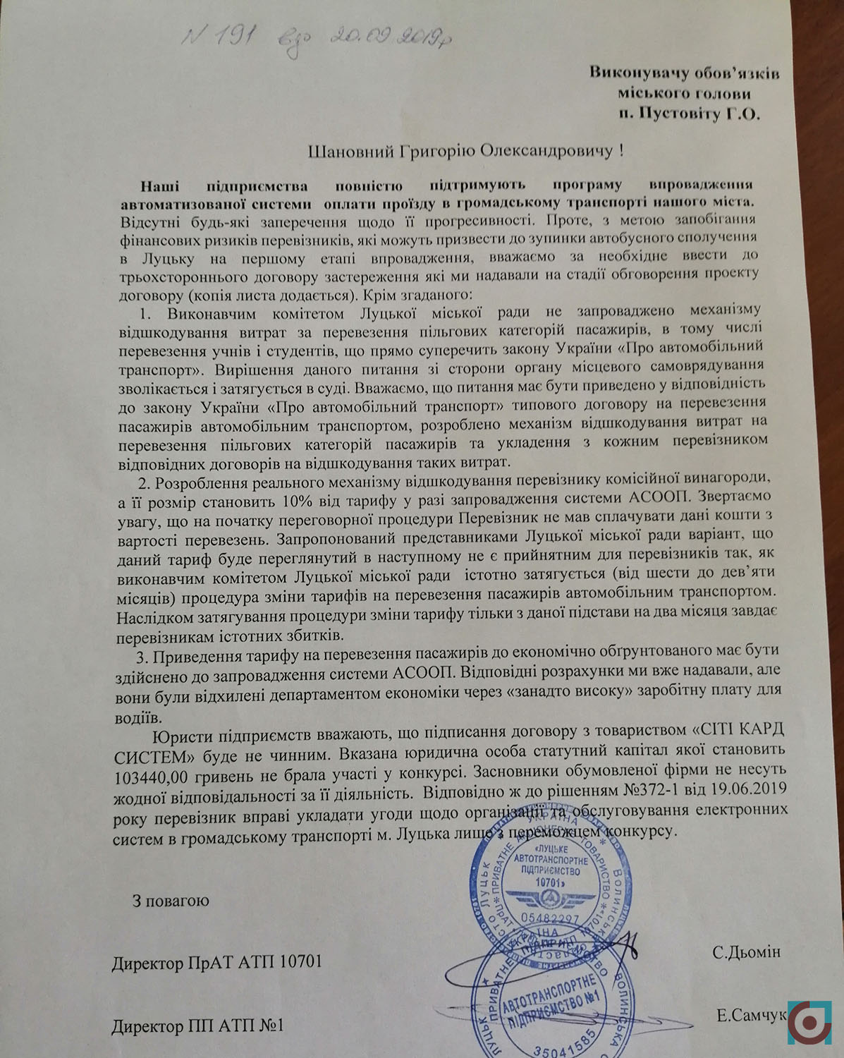– Ми спеціалізоване підприємство і займаємось виключно міськими пасажирськими перевезеннями. Коли нам доведеться припинити перевезення 11 листопада, підприємство нічого більше робити не зможе. Після 10 числа може вийдемо колективом до міськради, бо вони позбавлять роботи і заробітку 200 чоловік, – у такому настрої минула розмова із керівником одного з найбільших луцьких автотранспортних підприємства «АТП 10701» Сергієм Дьоміним за тиждень до впровадження електронного квитка у Луцьку. Жоден із приватних перевізників виявився не готовим до нього.