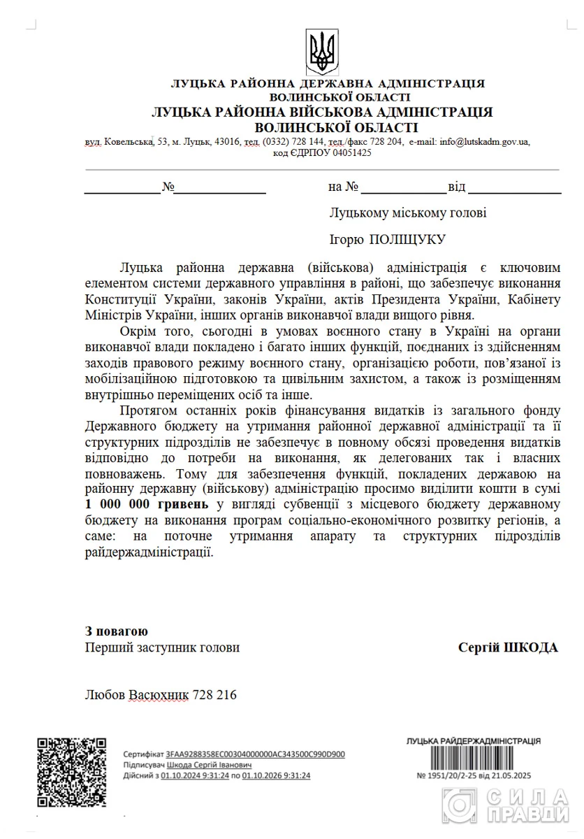 Питання про пів мільйона субвенції на утримання апарату і підрозділів цього виконавчого органу влади, який традиційно утримується коштом державного бюджету, виникло після офіційного звернення Луцької районної державної (військової) адміністрації у травні цього року до міськради. У листі, який має в розпорядженні «Сила правди», йдеться, що цей орган виконавчої влади не отримує належного фінансування вже не перший рік. При цьому підкреслює, що «є ключовим елементом системи держуправління в регіоні». Тож перший заступник голови райадміністрації Сергій Шкода звернувся з проханням про виділення мільйона гривень й мотивував ще одним аргументом: мовляв, у час війни апарат виконує звичну та ще додаткову роботу.