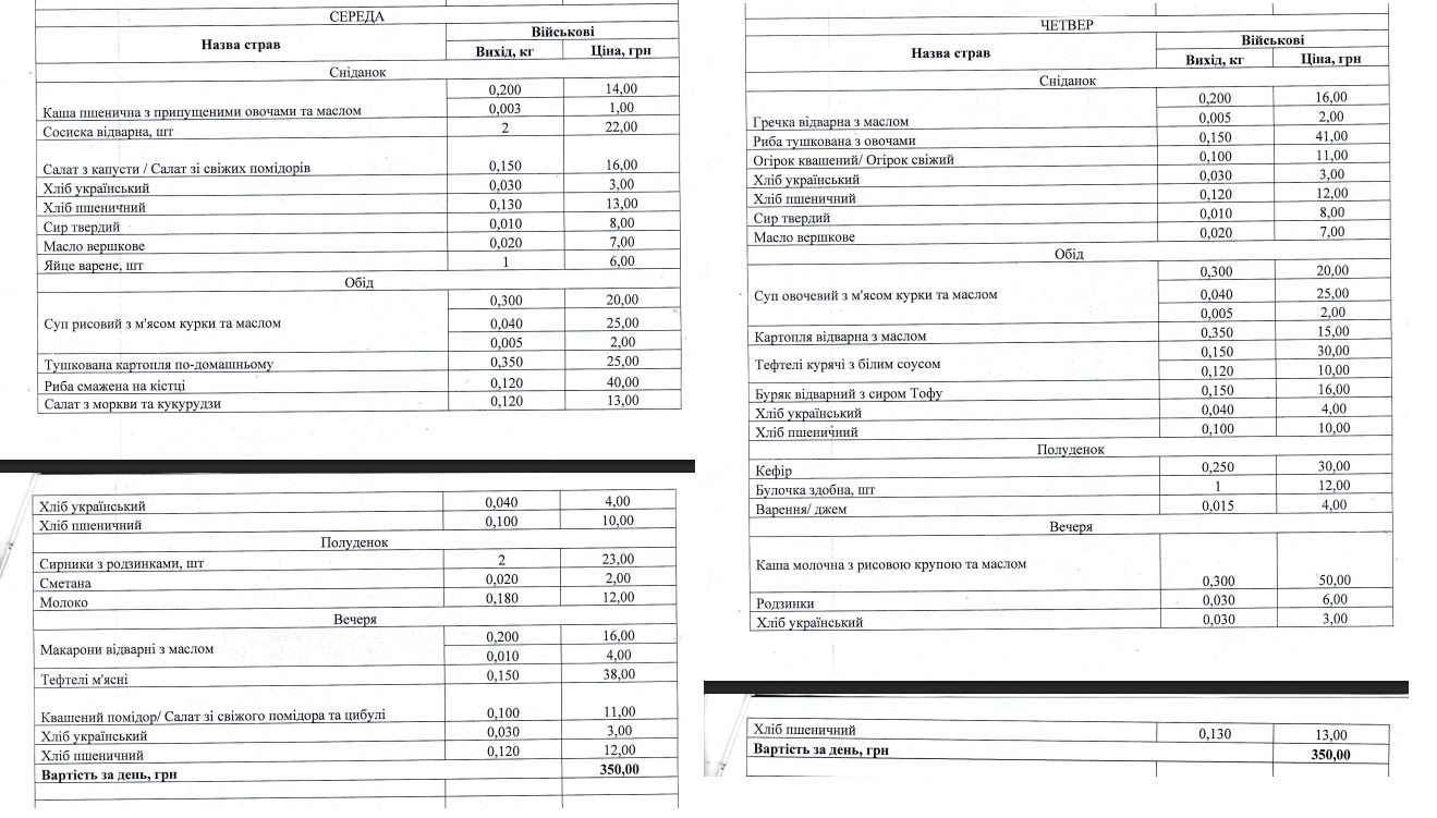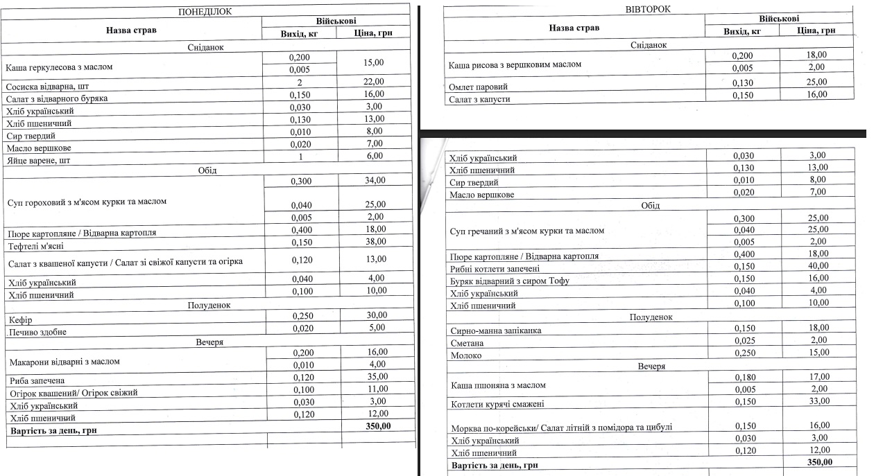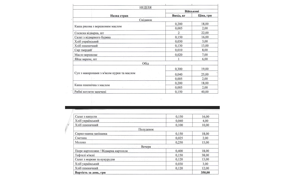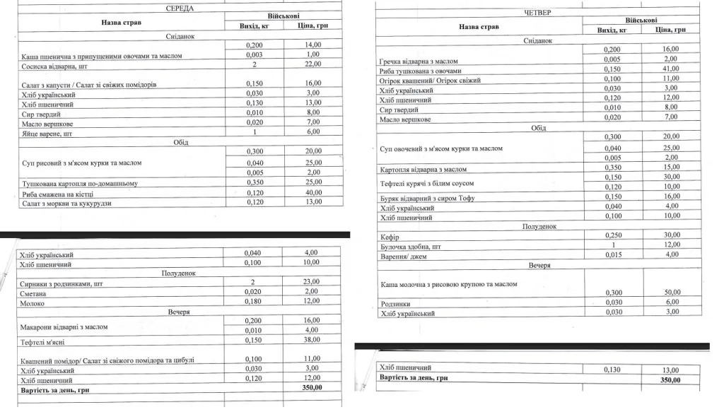 За ці гроші передбачено, наприклад, у четвер сніданок із гречки з маслом, тушкованої риби з овочами, квашеного або свіжого огірка, двох шматочків хліба, скибки сиру та масла. На обід – овочевий суп з куркою, варена картопля з маслом, курячі тефтелі з білим соусом, варений буряк з сиром тофу та хліб. Полуденок – це булочка, варення та кефір. Вечерятимуть пацієнти рисовою молочною кашею, родзинками, хлібом з маслом та сиром.