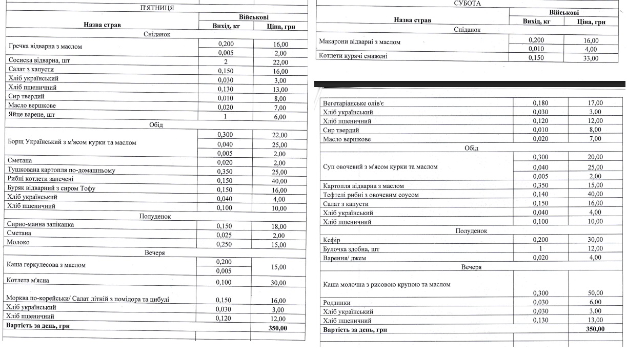 В інші дні в меню є борщ, гороховий суп, сосиски, курячі та рибні котлети, тушкована картопля, сирники, омлет та інше. Згідно з вимогами, гарячі страви повинні мати температуру 60–65 градусів, а холодні наїдки – 10–15 градусів.