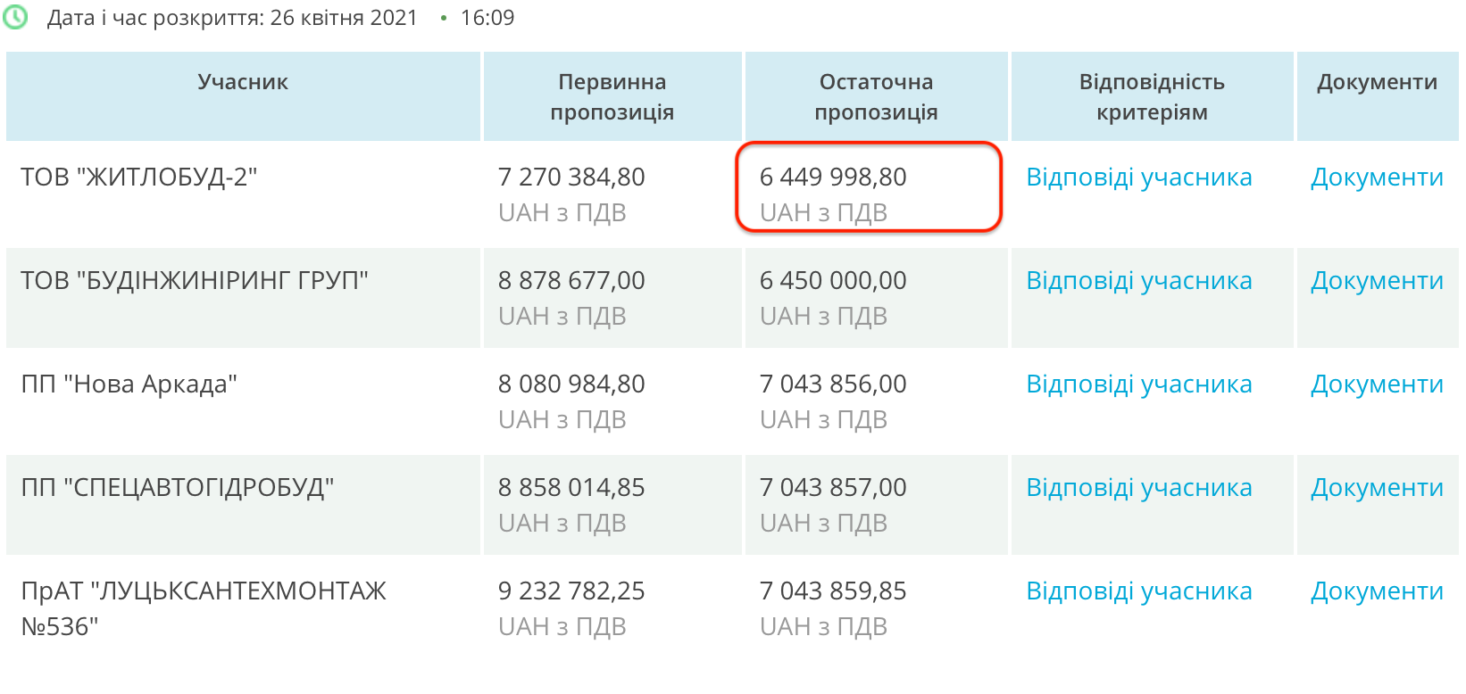 Свої пропозиції на торги подало п’ять учасників: ПрАТ «Луцьксантехмонтаж №536», ПП «Спецавтогідробуд», ПП «Нова аркада», ТОВ «Будінжиніринг груп» і ТОВ «Житлобуд-2». В результаті торгів підприємства суттєво знизили свої ціни, а перемогу здобув учасник із найнижчою пропозицією – ТОВ «Житлобуд-2». Ці роботи підприємство зобов’язалось виконати до кінця 2021 року майже за 6 мільйонів 450 тисяч гривень.