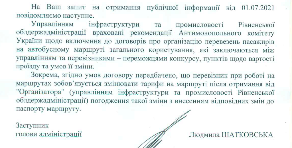 У сусідній Рівненській обласній державній адміністрації «Силі правди» підтвердили, що рекомендації Антимонопольного комітету врахували і у договорах із перевізниками передбачають вартість проїзду. А перевізники змінюють тарифи лише за погодженням із замовником перевезень, тобто облдержадміністрацією.
