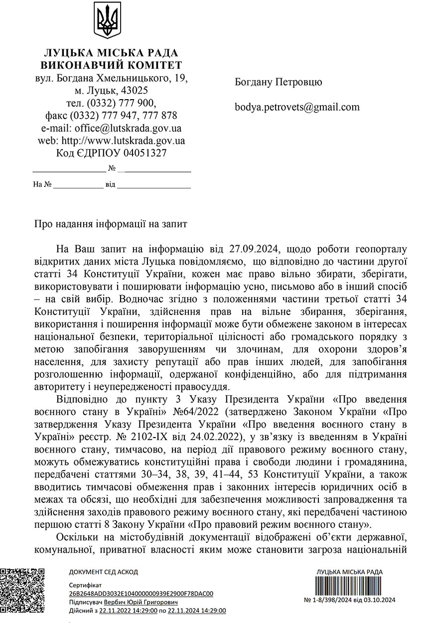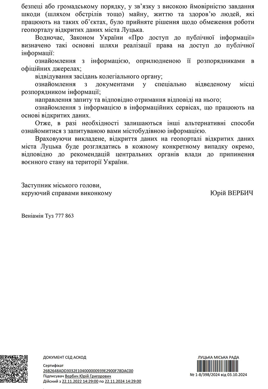У листі, який у відповідь надіслала Луцька міська рада, йдеться, що зникнення генерального плану з геопорталу пов’язане із запровадженням воєнного стану. У ньому також зазначено, що доступ до містобудівної документації був обмежений у рамках заходів, спрямованих на захист об’єктів критичної інфраструктури та безпеки міста.