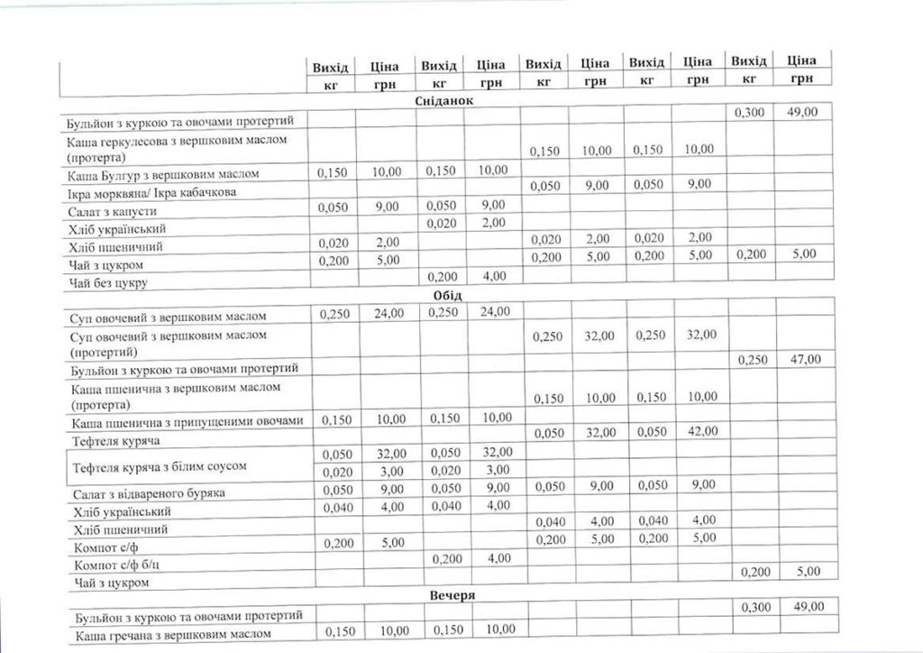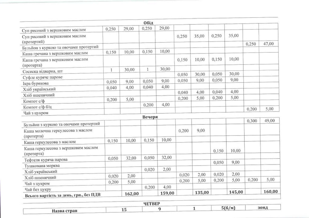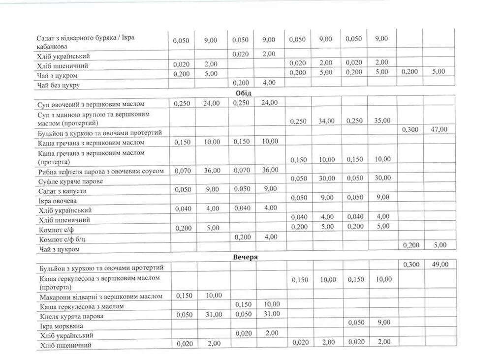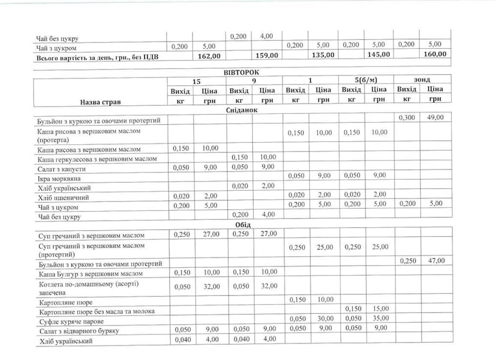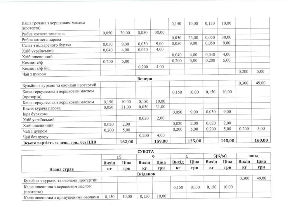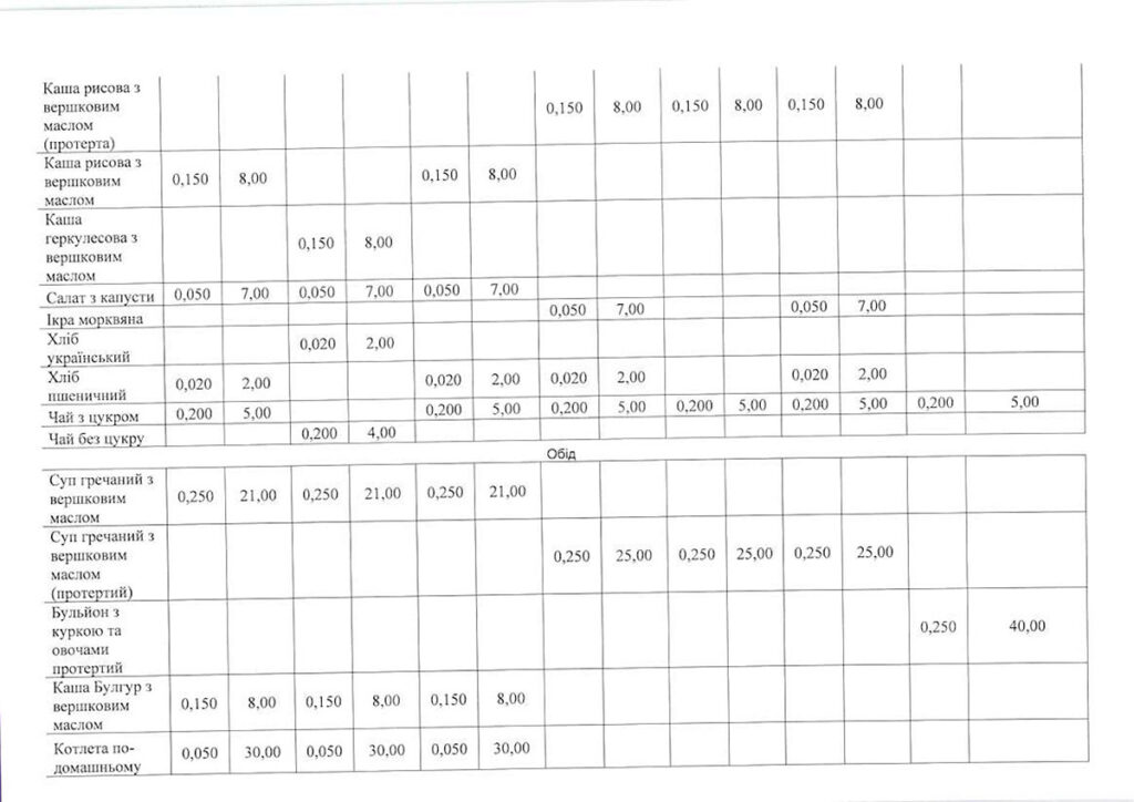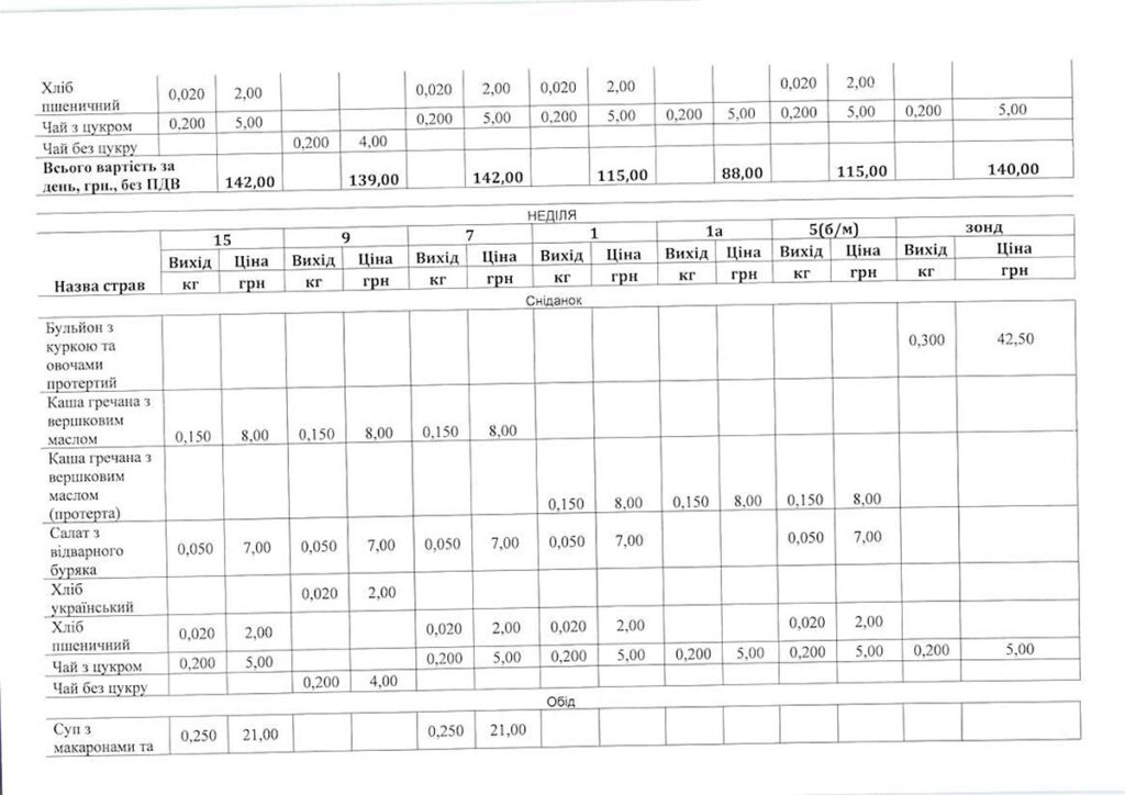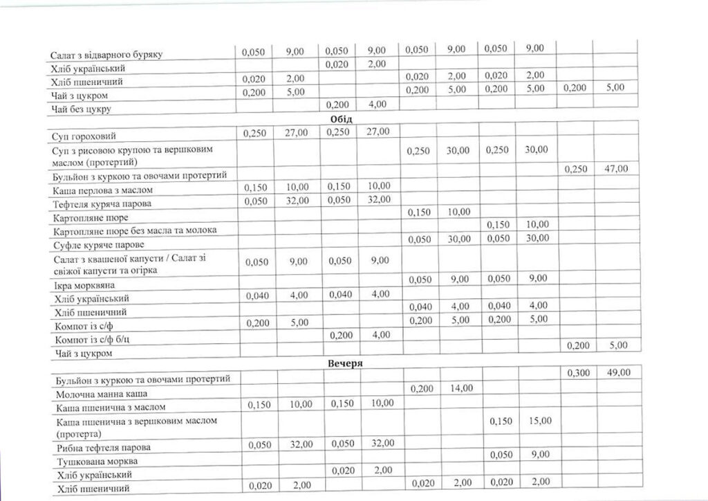 У відділенні реабілітації медобʼєднання розраховують харчування на 20 тисяч 700 ліжко-днів, а середня вартість одного – 158,18 гривні. Ліжко-дні мають різну вартість залежно від дієти пацієнта. Найдешевший здебільшого сніданок, найдорожчий – обід.