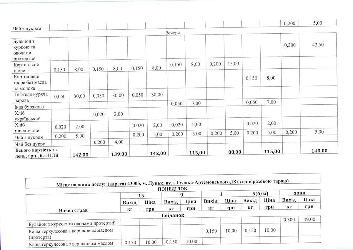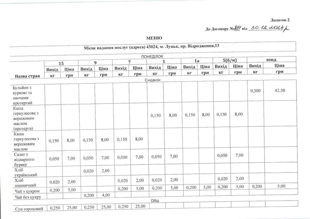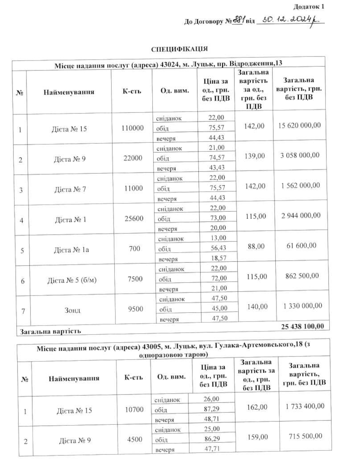Згідно з ним пацієнтів КП «Медобʼєднання Луцької міської територіальної громади» з 1 січня до 31 грудня 2025 року повинні будуть сім днів на тиждень забезпечувати триразовим харчуванням. Безпосередньо у Луцьку міську лікарню планують упродовж року доставити їжі з розрахунку на 186 тисяч 300 ліжко-днів, середня вартість одного – 136,54 гривень.