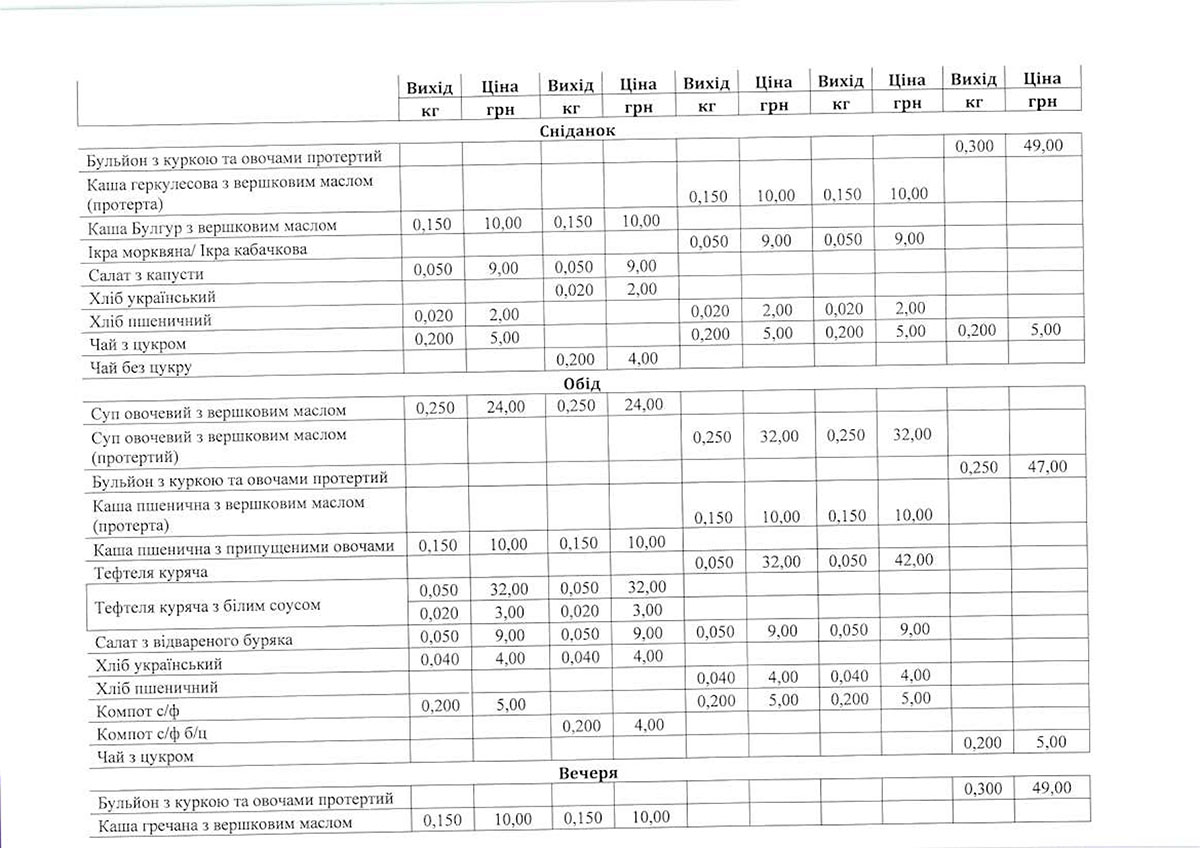 Пацієнтів реабілітаційного відділення, що на вулиці Грушевського, харчуватимуть так само. Однак вартість порцій на кілька гривень вища через додаткову ціну посуду: їм подаватимуть їжу в одноразовій тарі. До прикладу, за пацієнта стаціонару лікарні, який харчуватиметься відповідно до дієти №9, за день установа заплатить 139 гривень, а пацієнт відділення реабілітації з тією ж дієтою, з тими ж стравами, обійдеться лікарні у 159 гривень.