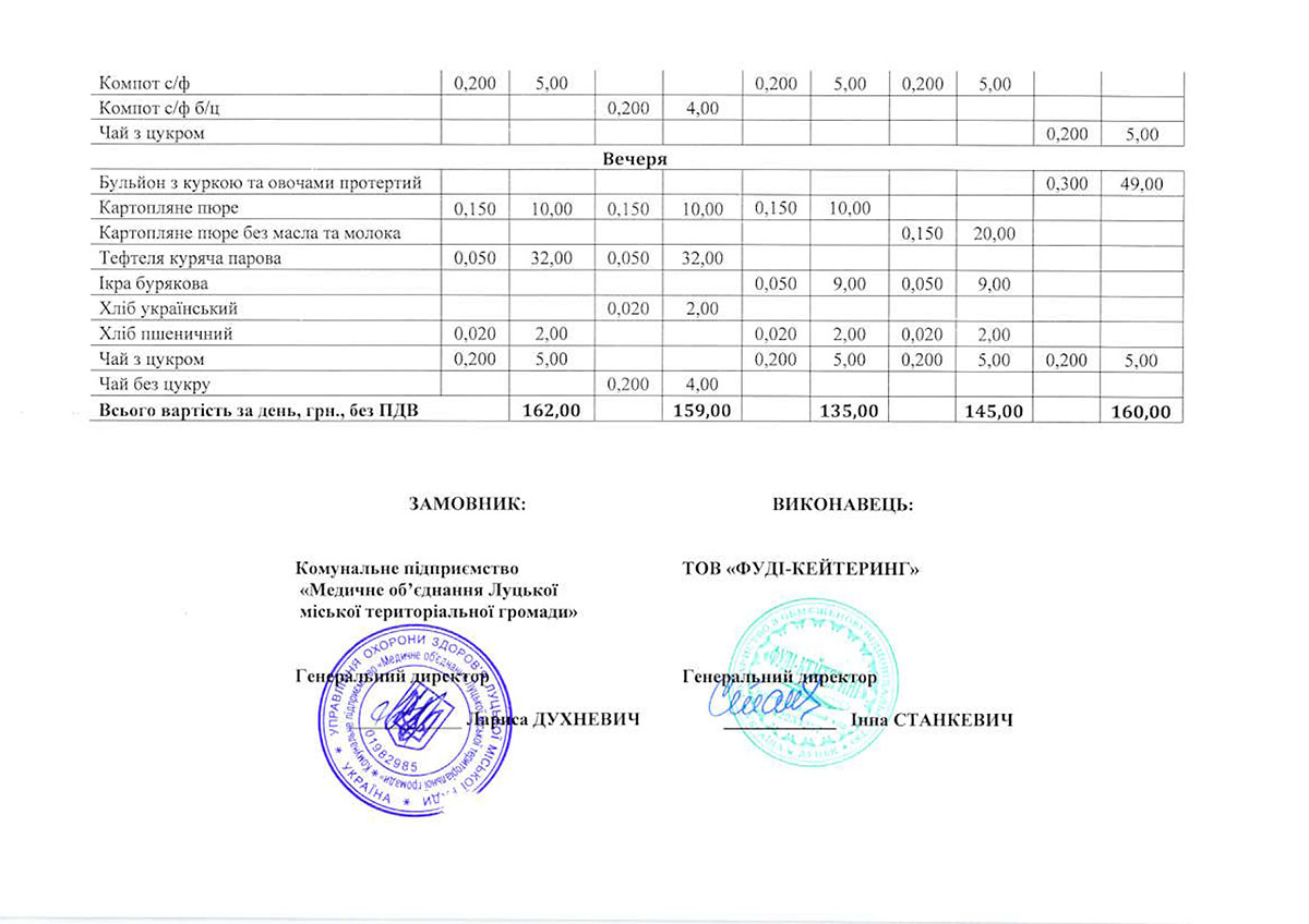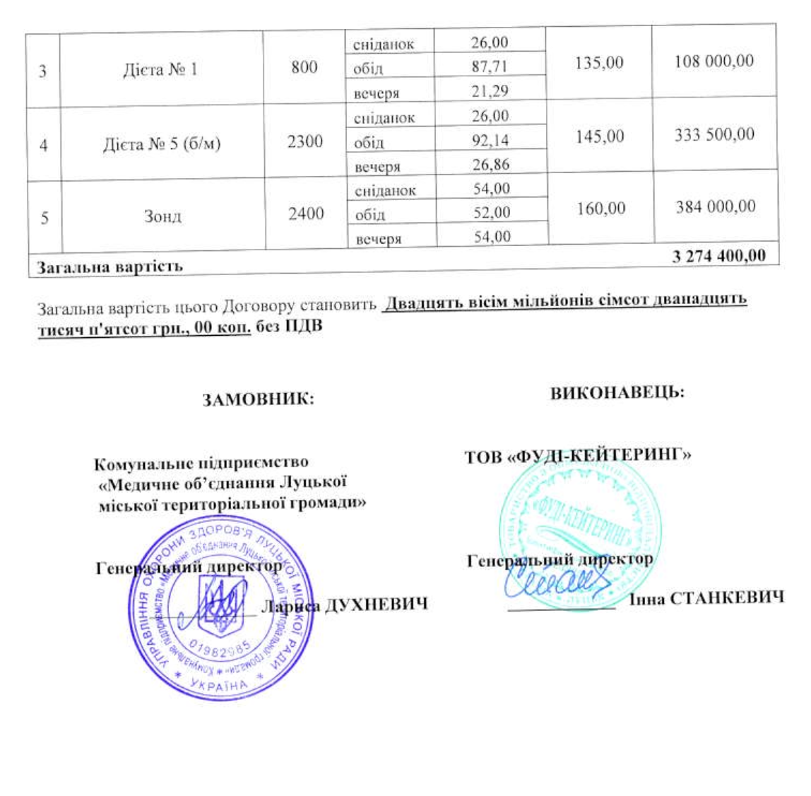 Компанія «Фуді-Кейтеринг» зобовʼязана привозити їжу до буфетів відділень за двома адресами луцького медоб’єднання тричі на день сім днів на тиждень. Розраховуватися з нею медустанова повинна за кожні 10 днів місяця протягом року.