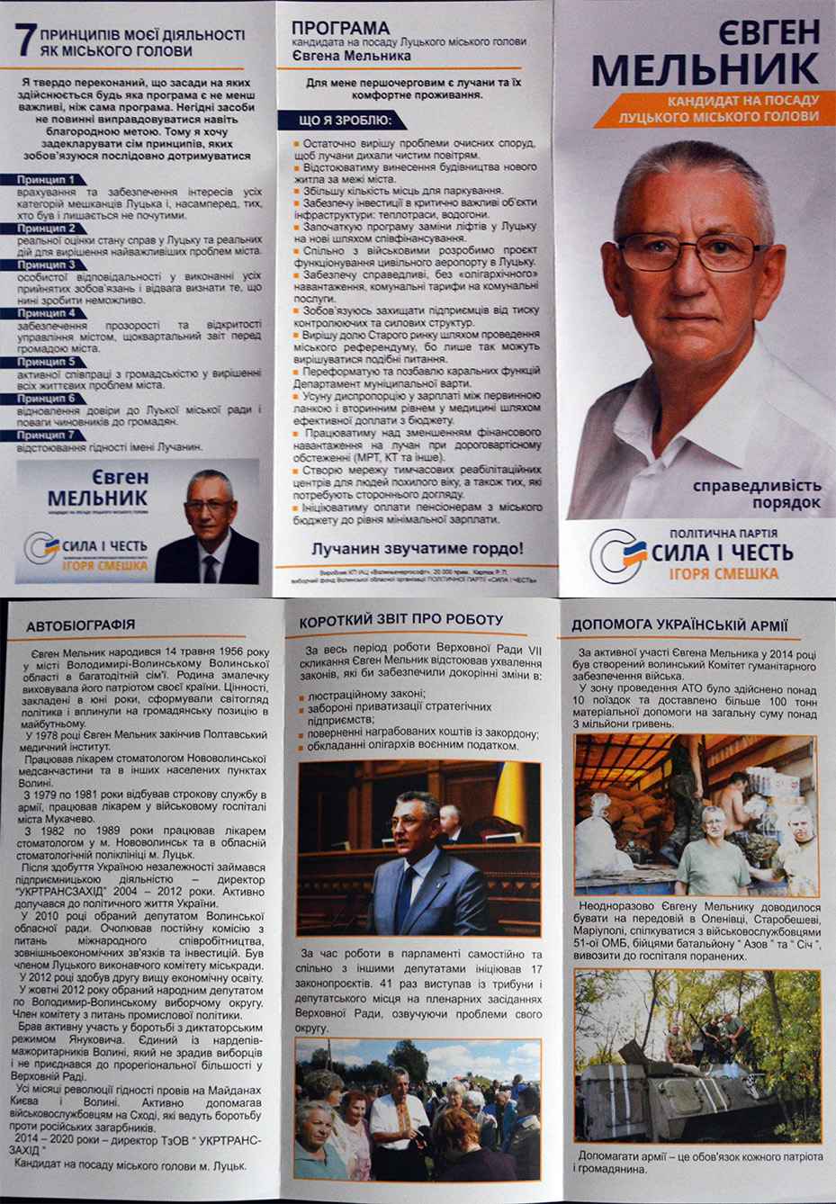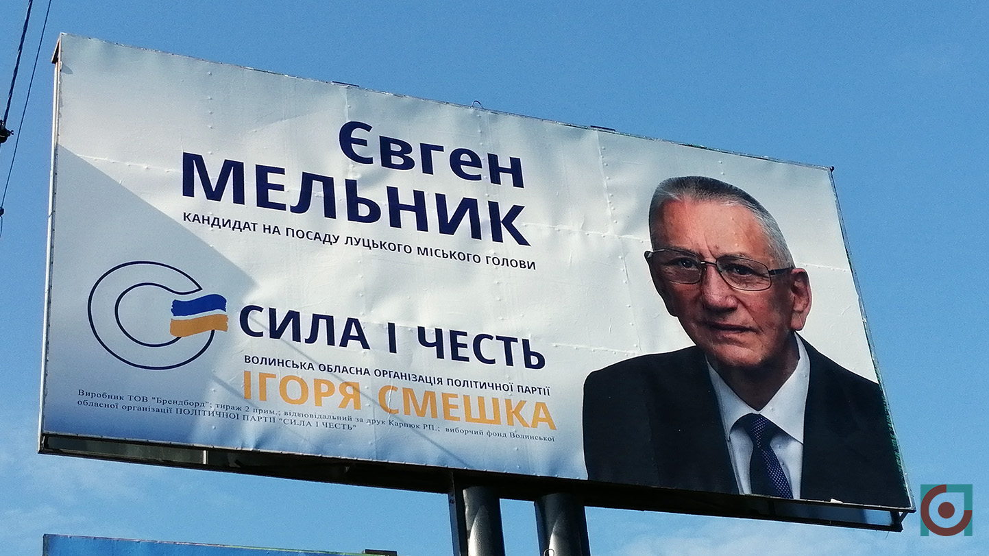 Висуванець партії «Сила і честь» Євген Мельник також не подав до ТВК ні проміжного, ні остаточного фінансового звітів. Під час виборчої кампанії він виходив у прямий ефір на Громадському інтерактивному телебаченні. На агітках кандидата вказано, що їх виготовлення оплатили з виборчого фонду обласної організації політичної партії «Сила і честь». Такі ж вихідні дані і на двох білбордах з його зображенням.
