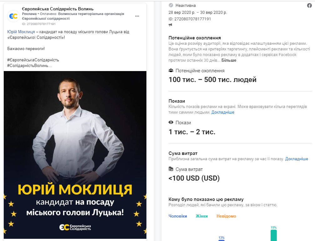Окрім того, у вересні один пост про кандидата на посаду Луцького міського голови Юрія Моклицю ставив на рекламу волинський обласний осередок партії «Європейська Солідарність».