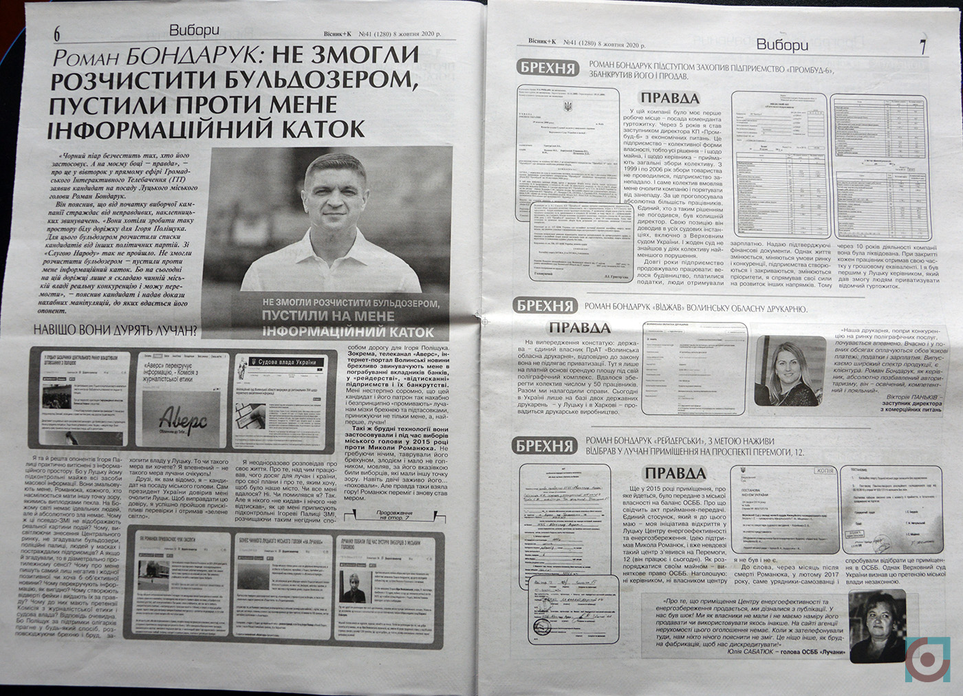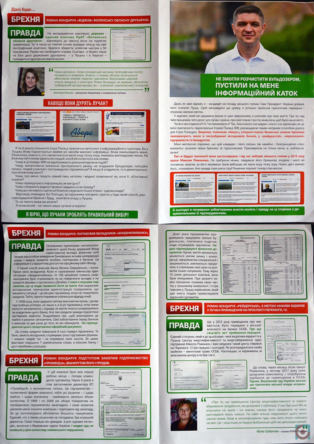 Також під час виборчої кампанії поширювали агітку-спростування від Романа Бондарука інформаційних статей та сюжетів окремих волинських ЗМІ. Вона була без вихідних даних, тож перевірити чи оплачено її виготовлення з виборчого фонду неможливо.