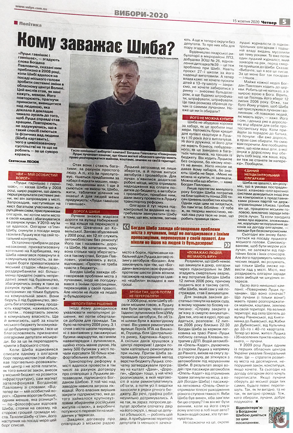 Богдан Шиба був Луцьким міським головою з 2006 по 2010 рік. На місцевих виборах у 2020-ому вирішив повторити. Спершу йому пророкували висування від партії «Голос», але він пішов на вибори Луцького міського голови сам, без партійної команди. Згідно офіційних фінансових звітів, витратив на два тури виборчої кампанії 358 тисяч 406 гривень. Всі кошти за фінзвітом – особисті. Богдан Шиба не дивився на лучан з білбордів, а натомість – з екранів телевізорів, комп’ютерів та смартфонів.