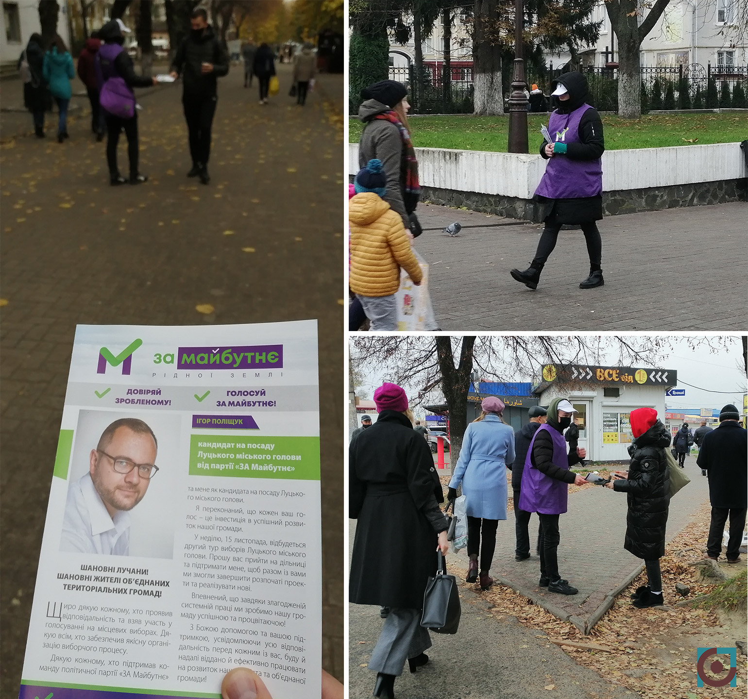 Напередодні першого та другого туру виборів «Сила правди» зафіксувала, що агітки Ігоря Поліщука роздавали молоді люди в брендованій продукції партії «За Майбутнє». 13 листопада – за два дні до другого туру виборів – «Сила правди» зафіксувала чотирьох таких осіб в різних районах міста.
