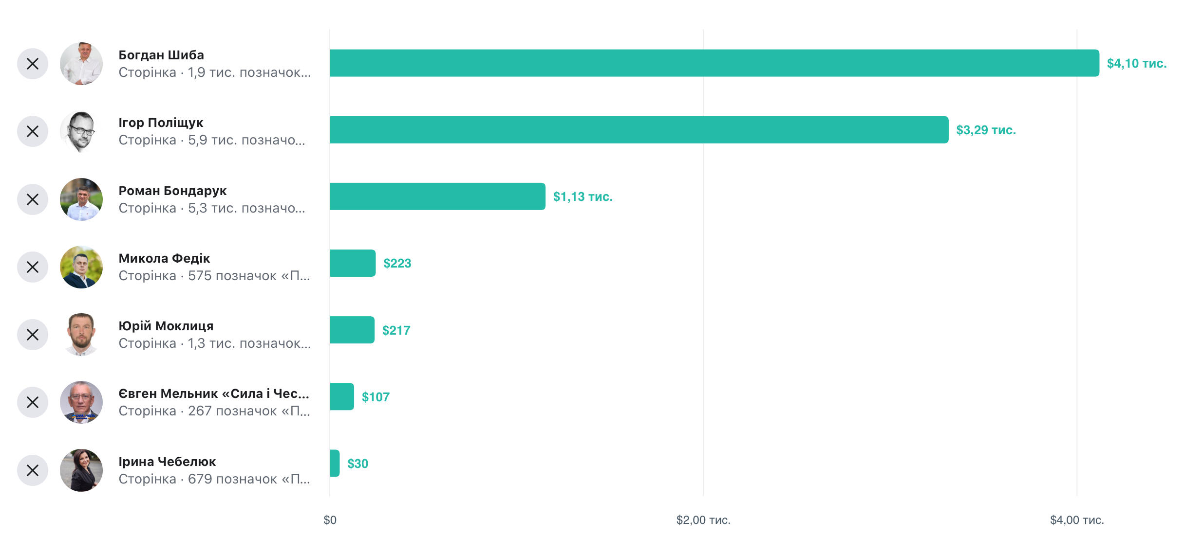 Найбільше витратив на виборчу кампанію Ігор Поліщук – 2,7 млн. грн., значно відстав від нього, але посів другу позицію за видатками Роман Бондарук – 422 тис. грн., бронза – у фіналіста виборів Богдана Шиби – 358 тисяч, Ірина Чебелюк витратила 164 тис. грн., Юрій Моклиця – 53,5 тис. грн., Дмитро Глазунов – 15,5 тис. грн., а Артур Мартіросян взагалі 14,5 тис. грн.