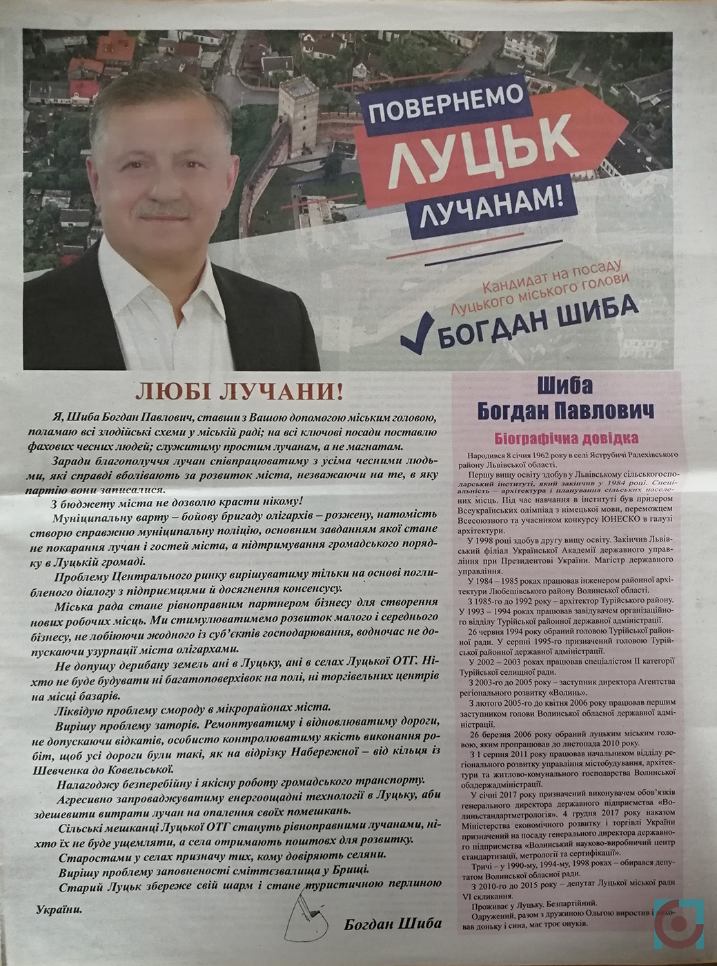 Кандидат на посаду Луцького міського голови, генеральний директор ДП «Волиньстандартметрологія» Богдан Шиба поклав на свій виборчий рахунок 193 тис. грн власних коштів. Майже усю цю суму він витратив за трохи більше, ніж два тижні кампанії.