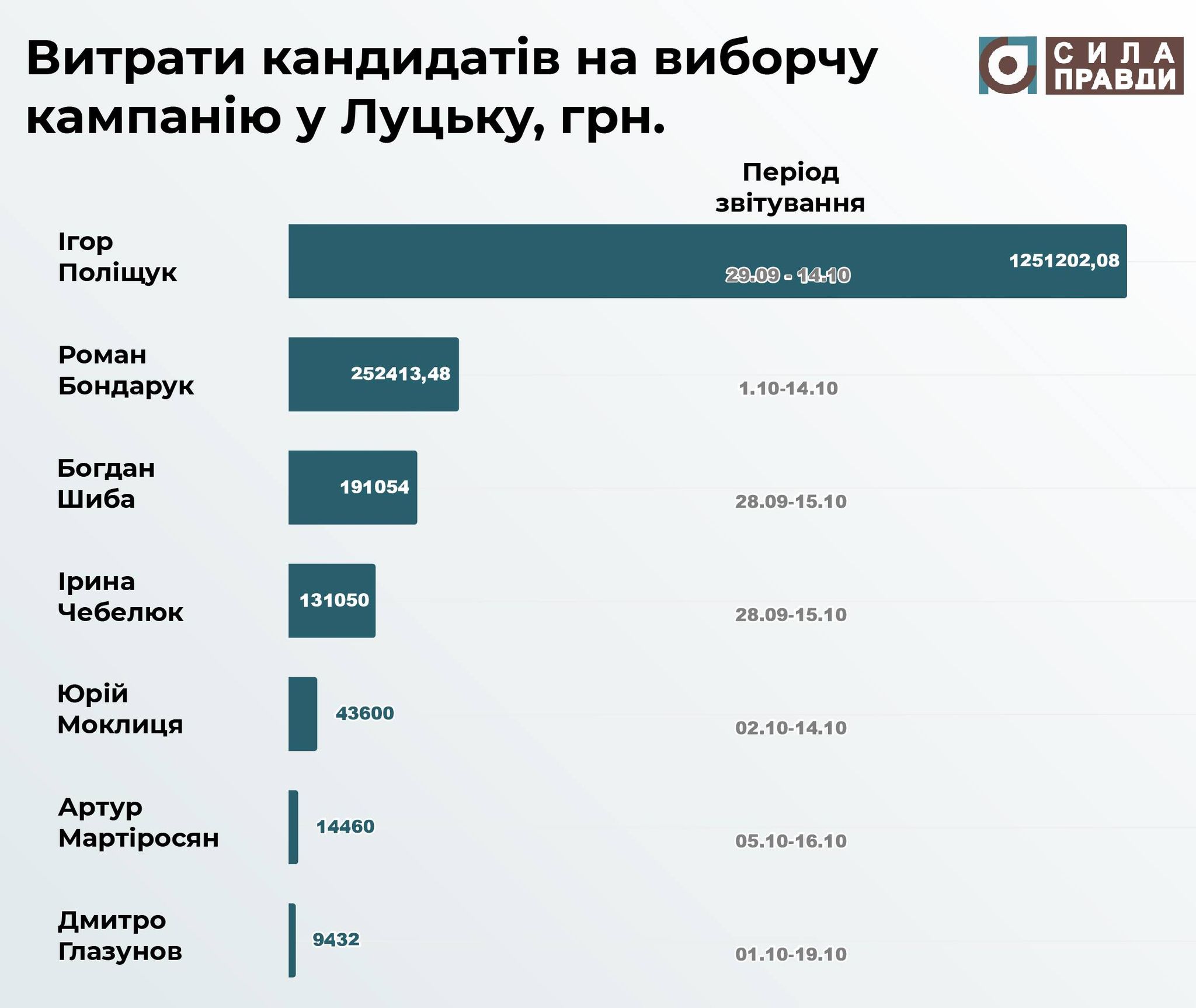 Кандидати на посаду Луцького міського голови за два тижні на свої виборчі кампанії офіційно витратили 1,89 мільйона гривень. Найбільше витратив висуванець від партії «За майбутнє» Ігор Поліщук, найменше – самовисуванець Дмитро Глазунов. Ще четверо кандидатів не здійснювали витрат, а троє з них не відкривали власного виборчого фонду. Їхні виборчі кампанії фінансували партії.