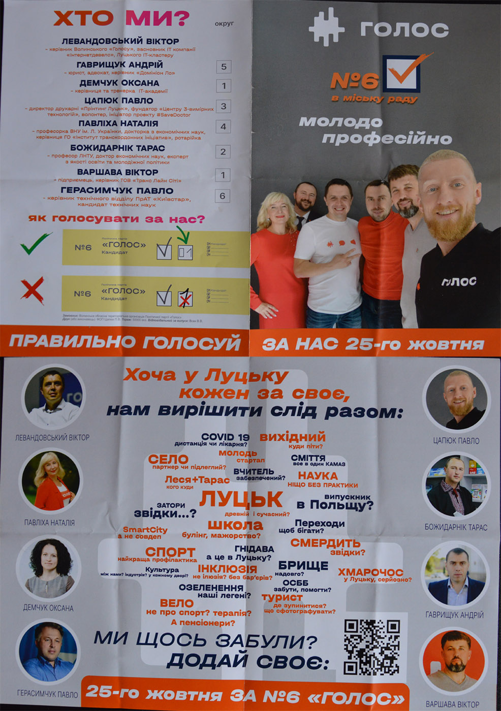 «Європейська солідарність» витратила на вибори до Луцької міськради 121 тисячу гривень і майже всі кошти (113,9 тисяч грн) вклала у друк агітаційної продукції – флаєрів, листівок та буклетів.