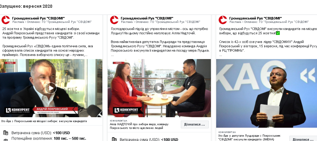 За даними Бібліотеки реклами Facebook зі сторінки «Громадянського руху «Свідомі» впродовж виборчої кампанії запустили реклами на близько 800 доларів США. Ініціативи та кандидатів партії рекламували і зі сторінки інформаційного агентства «Конкурент» – ще близько 200 доларів США, що загалом становить близько 27 тисяч гривень. Однак, у фінзвіті виборчого фонду витрат на соцмережі вказано лише 9,5 тисяч гривень.