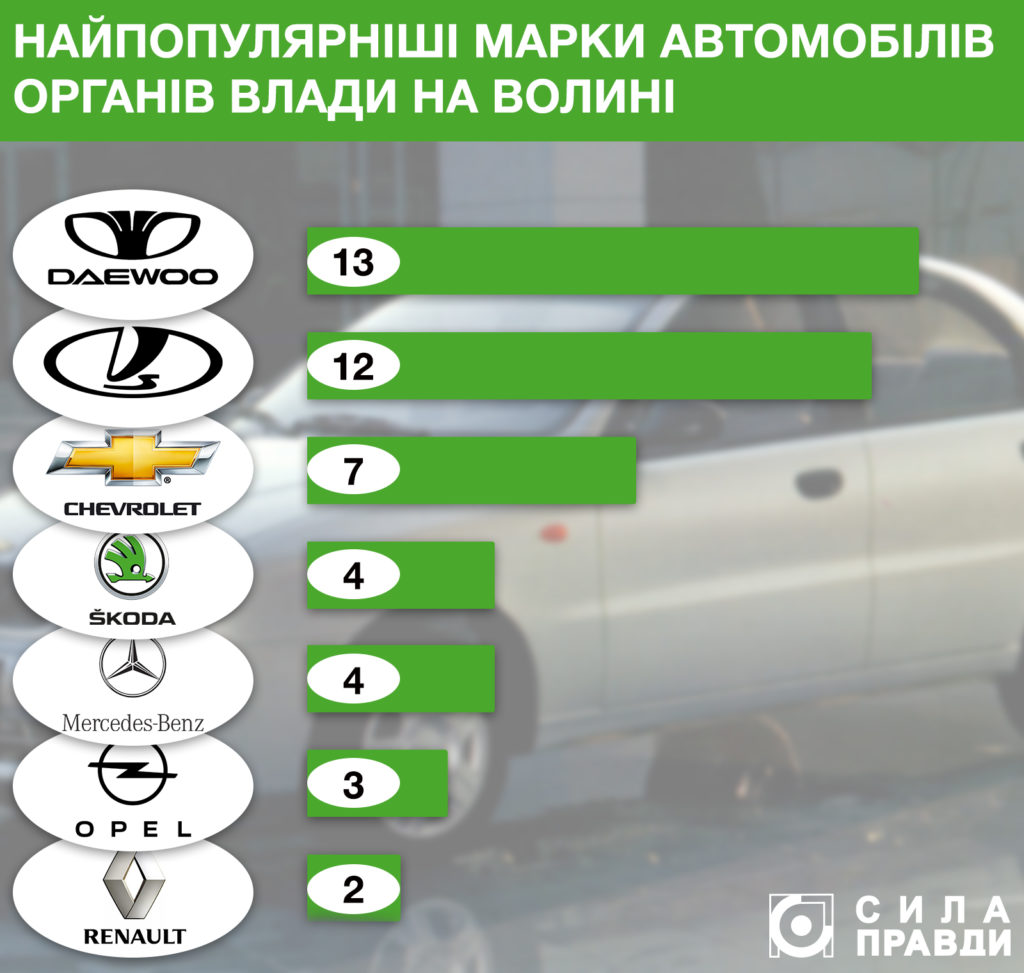 Найпопулярнішою маркою автомобілів серед усіх рад виявилась «Daewoo». Посадовці їздять аж на 13-ти таких транспортних засобах. Окрім того, у радах використовують 12 автомобілів марки «ВАЗ» та сім – «Chevrolet».
